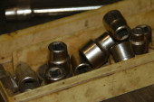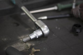 Mechanik ręce dokręcić nakrętkę z klucza podczas naprawy silnika