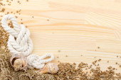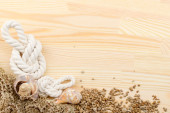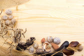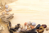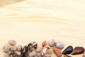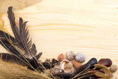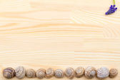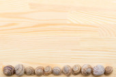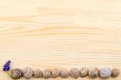 ślimak na powierzchni drewnianych, Kamyczki, muszle, trawa, dzikie kwiaty,