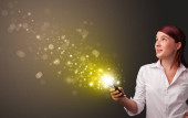 Piękna dziewczyna wieje abstrakcyjne kolorowe pęcherzyki i linie