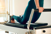 Stylowa młoda kobieta w różowy sportowy biustonosz i legginsy ćwiczenia.