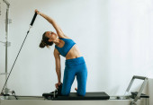 Kobieta w różowej bluzce i legginsach wykonuje energiczne ćwiczenia.