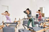 Różnorodna grupa kobiet stojących pewnie na siłowni, gotowa do sesji treningowej.