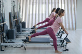 Dynamiczna grupa sportowców biorących udział w sesji pilates na siłowni.