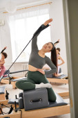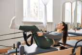 Sportowa kobieta demonstruje wdzięk i siłę, wykonując obrót podczas lekcji pilates.