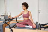 Sportowa kobieta w różowej bluzce i legginsy na lekcji pilatesu.