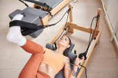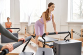 Sportowa kobieta bierze udział w lekcji pilates na siłowni.
