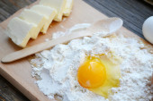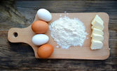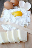 białej mąki z jaj, masła i drewnianą łyżką na boardzie gotowania