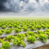 Zielona sałata na polu agricuture z błękitnego nieba