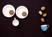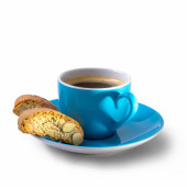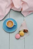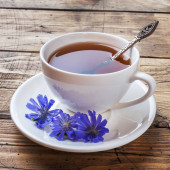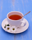 Filiżanka Biała herbata i kwiaty na niebieskie poziome drewniane