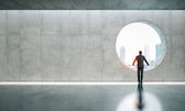 Biznesmen w labiryncie i miasto na horyzoncie. renderowania 3D
