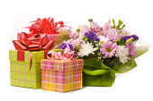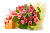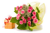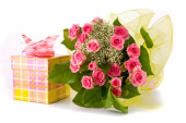 bukiet pięknych róż i obecnych skrzynek na białym tle