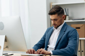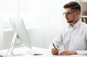 przystojny garnitur lider gospodarstwa laptop sukces komunikacja planowanie pozytywny biały dokument biznesmen papier firma uśmiechnięta ekspertyza miejsce pracy biuro styl życia szczęśliwy koncepcja okulary profesjonalny