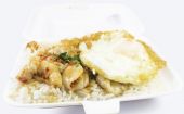Lunchowy, smażony ryż z wieprzowiny i jajka sadzone, w polu pianki.