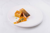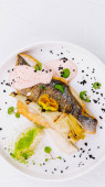 Widok z góry pyszny łosoś filet pokryty żywe warzywa i sos na białym tle