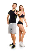Sportowe para - mężczyzna i kobieta z hantlami na biały