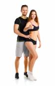 Sportowe facet trzyma na ramieniu dziewczyny na białym