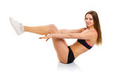 Szczęśliwa kobieta lekkoatletycznego robi treningu sportowego, na białym tle