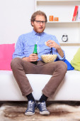 Zdjęcie "Znudzony człowiek z popcornem i piwo" może być wykorzystywane do celów osobistych i komercyjnych zgodnie z warunkami zakupionej licencji Royalty-free. Obraz jest dostępny do pobrania w jakości wysokiej rozdzielczości do 5760x3840.
