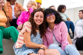 Zdjęcie "Dwie młode kobiety w luźnych ciuchach obściskują się, będąc pochłonięte telefonami komórkowymi, zdając się przeżywać wyjątkowy moment.." może być wykorzystywane do celów osobistych i komercyjnych zgodnie z warunkami zakupionej licencji Royalty-free. Obraz jest dostępny do pobrania w jakości wysokiej rozdzielczości do 5760x3840.