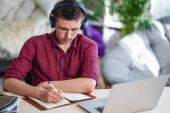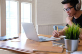 Zdjęcie "Uroczy chłopiec z zespołem Downa jest pochłonięty korzystaniem z laptopa i noszeniem słuchawek przy stole.." może być wykorzystywane do celów osobistych i komercyjnych zgodnie z warunkami zakupionej licencji Royalty-free. Obraz jest dostępny do pobrania w jakości wysokiej rozdzielczości do 5760x3840.