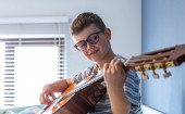Chłopiec z zespołem Downa siedzi na kanapie z rękawiczką baseballową.