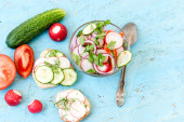 Wiosną sałatka z rzodkiewki, ogórek, kapusta i cebula z bliska