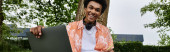 Zdjęcie "Young man, African American, holding a microphone in a park." może być wykorzystywane do celów osobistych i komercyjnych zgodnie z warunkami zakupionej licencji Royalty-free. Obraz jest dostępny do pobrania w jakości wysokiej rozdzielczości do 5760x3840.