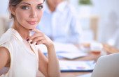Biznesmeni siedzą i dyskutują na spotkaniu biznesowym