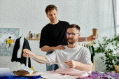 Dwóch mężczyzn, para gejów, stoi obok siebie w warsztacie projektantów, współpracując nad modnym strojem.