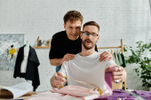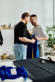 Dwóch mężczyzn bada stylową niebieską koszulę wyświetlaną na manekinie w warsztacie projektanta.