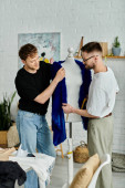 Dwóch mężczyzn pracuje obok manekina w warsztacie projektanta, projektując unikalny strój.