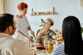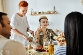 Grupa ludzi, którzy jedzą razem posiłek, w tym kochająca się lesbijska para.