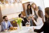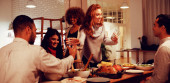 Różnorodna grupa przyjaciół, w tym kochająca para lesbijek, pije wino przy stole.
