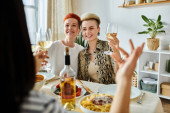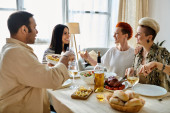 Różnorodna grupa delektująca się jedzeniem i winem podczas kolacji.