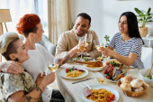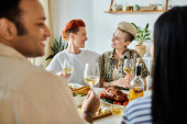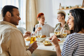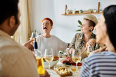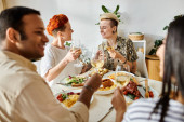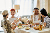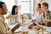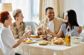 Różnorodna grupa przyjaciół lubi jedzenie i picie przy stole w domu..
