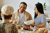 Zdjęcie "Różnorodna grupa przyjaciół lubi jedzenie i picie przy stole w domu.." może być wykorzystywane do celów osobistych i komercyjnych zgodnie z warunkami zakupionej licencji Royalty-free. Obraz jest dostępny do pobrania w jakości wysokiej rozdzielczości do 5760x3840.