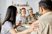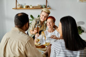 Lesbijki para i różnorodne przyjaciele korzystających posiłek przy stole.