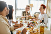 Grupa ludzi delektujących się jedzeniem i winem przy stole.