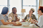 Zdjęcie "Różnorodna grupa przyjaciół, w tym kochająca para lesbijek, dzieląca posiłek przy domowym stole." może być wykorzystywane do celów osobistych i komercyjnych zgodnie z warunkami zakupionej licencji Royalty-free. Obraz jest dostępny do pobrania w jakości wysokiej rozdzielczości do 5760x3840.