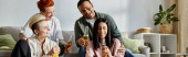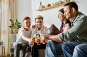 Różnorodna grupa ludzi, w tym kochająca się lesbijka, dzieląca chwile na kanapie.