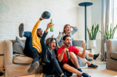 Zróżnicowana grupa przyjaciół, w tym kochająca się lesbijka, ciesząca się swoim towarzystwem siedząca na przytulnej kanapie.