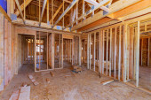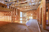 Nowy budynek mieszkalny w budowie oprawia niedokończoną drewnianą ramę z drewnianym kratownicą, ramę z belką postojową