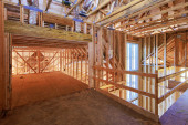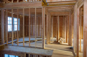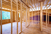 Zdjęcie "Nowy budynek mieszkalny w budowie oprawia niedokończoną drewnianą ramę z drewnianym kratownicą, ramę z belką postojową" może być wykorzystywane do celów osobistych i komercyjnych zgodnie z warunkami zakupionej licencji Royalty-free. Obraz jest dostępny do pobrania w jakości wysokiej rozdzielczości do 5760x3840.