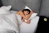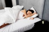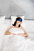 Kobieta, spanie w łóżku z zespołu oczy.