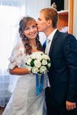 para ślub całowanie w lato zielony park. panny młodej i pana młodego, całowanie, stojąc razem na zewnątrz, przytulanie wśród zieleni drzew. Panna młoda trzyma Bukiet ślubny, kwiaty