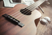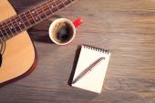 Filiżanka kawy z ukulele i notebooków na drewnianym stole