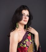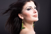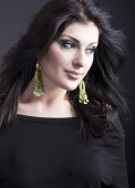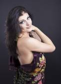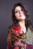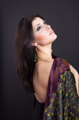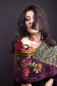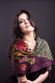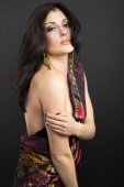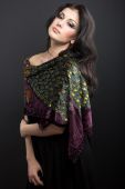 Atrakcyjny brunetka w jasne stroje na czarnym tle. Portret moda. Portret z piękną brunetką. Bright haftowane chustki