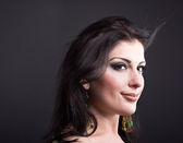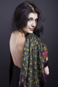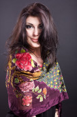 Atrakcyjny brunetka w jasne stroje na czarnym tle. Portret moda. Portret z piękną brunetką. Bright haftowane chustki