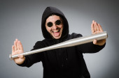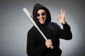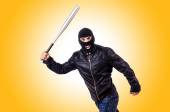Agresywny mężczyzna z kijem bejsbolowym na białym
