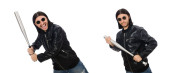Agresywny mężczyzna z kijem bejsbolowym na białym